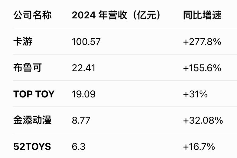以2024年為例,主做卡牌的卡游營收達到100.57億元;以拼搭積木為主的布魯可營收為22.42億元;名創(chuàng)優(yōu)品旗下潮玩公司TOP TOY則達到19.09億元;以及同樣主做潮玩的52TOYS營收6.3億元。