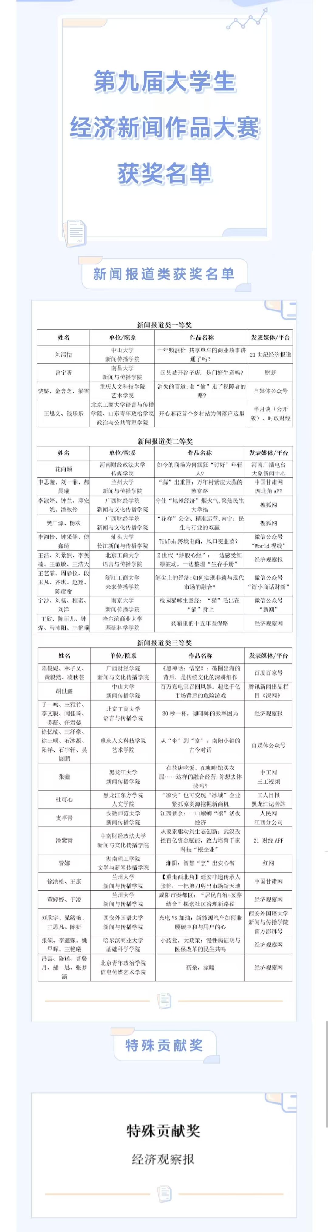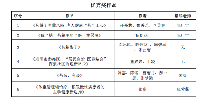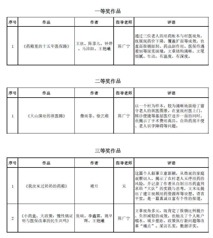 本次大賽的獲獎(jiǎng)作品同時(shí)報(bào)送至中國(guó)經(jīng)濟(jì)傳媒協(xié)會(huì)與北京工商大學(xué)語(yǔ)言與傳播學(xué)院聯(lián)辦的全國(guó)大學(xué)生經(jīng)濟(jì)新聞作品大賽參評(píng)。經(jīng)評(píng)委會(huì)嚴(yán)格評(píng)審,四篇作品脫穎而出、斬獲殊榮 ——《藥箱里的十五年醫(yī)保路》、《小藥盒,大政策:慢性病證明與醫(yī)保改革的民生共鳴》、《藥雜,家暖》、《咸陽(yáng)市秦都區(qū):“居民自治 + 醫(yī)養(yǎng)結(jié)合” 探索社區(qū)治理新路徑》分別榮獲新聞報(bào)道類二等獎(jiǎng)與三等獎(jiǎng)。