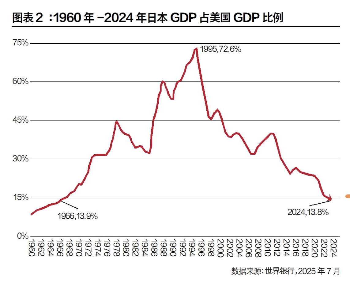 美國知名學者傅高義(EzraF.Vogel)在1979年發(fā)表的著作《日本第一:對美國的啟示》中,分析和肯定了日本在多方面的成功。但十年之后,日本的經(jīng)濟奇跡消逝,進入了長久的衰退和停滯不前。2024年日本的GDP只有美國的13.8%。