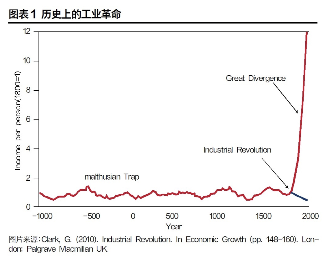 拋開中西之分,從全球來看,在過去幾千年里,世界經(jīng)濟曾長期處于“馬爾薩斯陷阱”所描述的低人均收入水平狀態(tài),這一情況直到第一次工業(yè)革命(1800年前后)才迎來轉(zhuǎn)折。少數(shù)國家的人均收入開始飆升,并逐步帶動了全球經(jīng)濟的騰飛,打破了持續(xù)到工業(yè)革命以前的“超穩(wěn)定”狀態(tài)。第一次工業(yè)革命將人類發(fā)展帶入了一個嶄新時代:經(jīng)濟發(fā)展迅猛,科技進步日新月異,社會變革的步伐不斷加速,歷史性的轉(zhuǎn)折點和關(guān)鍵拐點不斷涌現(xiàn)。